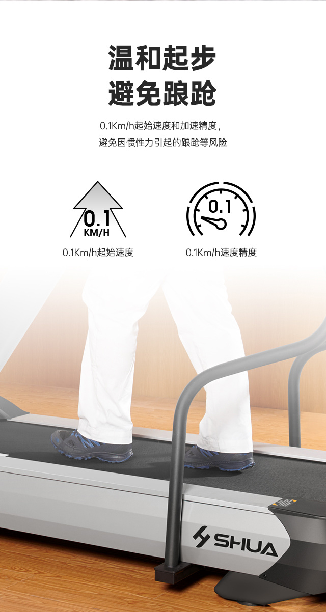 舒华V9尊享版跑步机SH-T899设有辅助上下机踏板的驱动踏板,控制速度在-5至10km/h内可调,坡度也可在-3至15%内可调,跑台尺寸是580×1570mm,持续马力是AC 3.0HP。